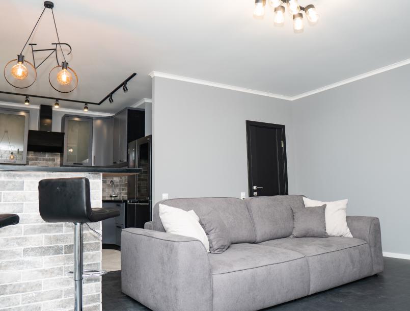 поклеили обои, сделали натяжные потолки, положили пол.